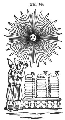 Now, this Son, who was symbolised as "Corn," was the SUN-divinity incarnate, according to the sacred oracle of the great goddess of Egypt: "No mortal hath lifted my veil. The fruit which I have brought forth is the SUN" (BUNSEN'S Egypt). What more natural then, if this incarnate divinity is symbolised as the "bread of God," than that he should be represented as a "round wafer," to identify him with the Sun? Is this a mere fancy? Let the reader peruse the following extract from Hurd, in which he describes the embellishments of the Romish altar, on which the sacrament or consecrated wafer is deposited, and then he will be able to judge: "A plate of silver, in the form of a SUN, is fixed opposite to the SACRAMENT on the altar; which, with the light of the tapers, makes a most brilliant appearance." What has that "brilliant" "Sun" to do there, on the altar, over against the "sacrament," or round wafer? In Egypt, the disk of the Sun was represented in the temples, and the sovereign and his wife and children were represented as adoring it. Near the small town of Babain, in Upper Egypt, there still exists in a grotto, a representation of a sacrifice to the sun, where two priests are seen worshipping the sun's image, as in the accompanying woodcut (Fig. 38).